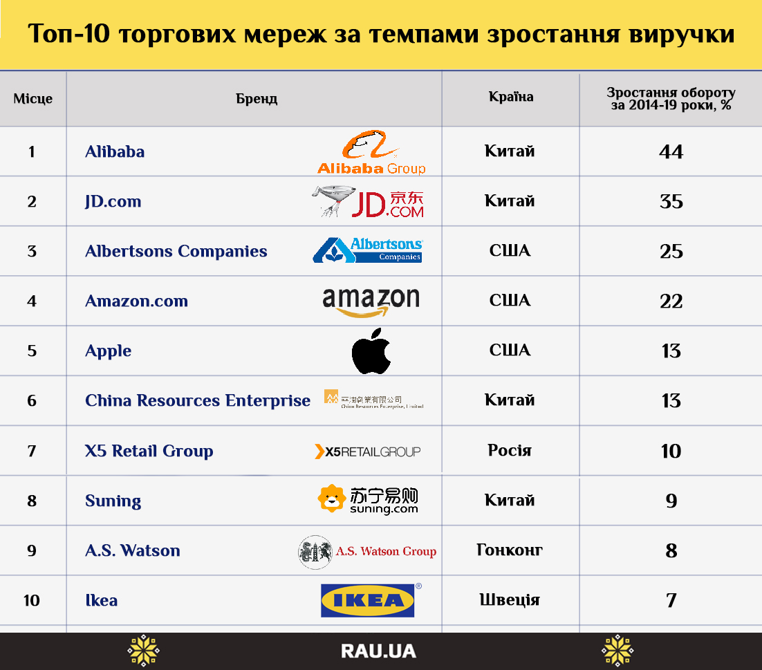Большой потенциал исследователи видят и у других ритейлеров из Поднебесной. Так, за 2019 год Alibaba подскочил с 33 места сразу на 25-е. Его темпы роста составили впечатляющие 44%. Правда, в будущем эксперты ожидают более скромных результатов – «всего» 14% – столько же, сколько и у Amazon.