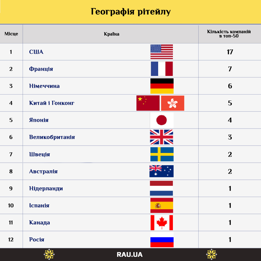 Тем не менее, пока в первой десятке сетей с самыми прибыльными торговыми точками семь компаний из США. Американские ритейлеры доминируют и общем мировом рейтинге: в топ-50 входят сразу 17 сетей из США. Примерно одинаково в мире представлены крупные игроки французского, немецкого и китайского ритейла. Впрочем, если брать всю Европу, то ее компаний больше всего в международной торговле – 21 (если считать Россию).