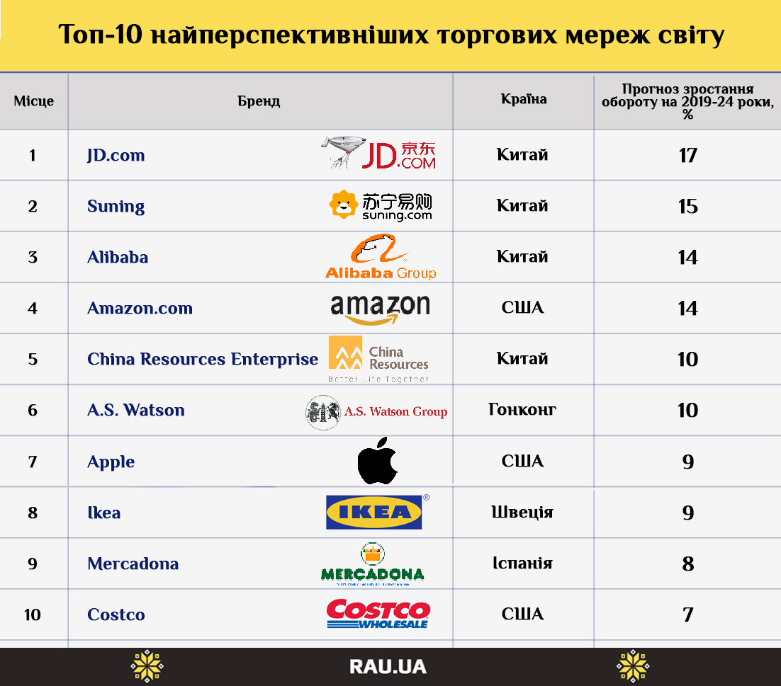 Пока в первой десятке ритейлеров по обороту только один ритейлер из Китая – JD.com. Но именно эта компания, как ожидается, будет наращивать обороты быстрее всех – на 17% за следующие пять лет.