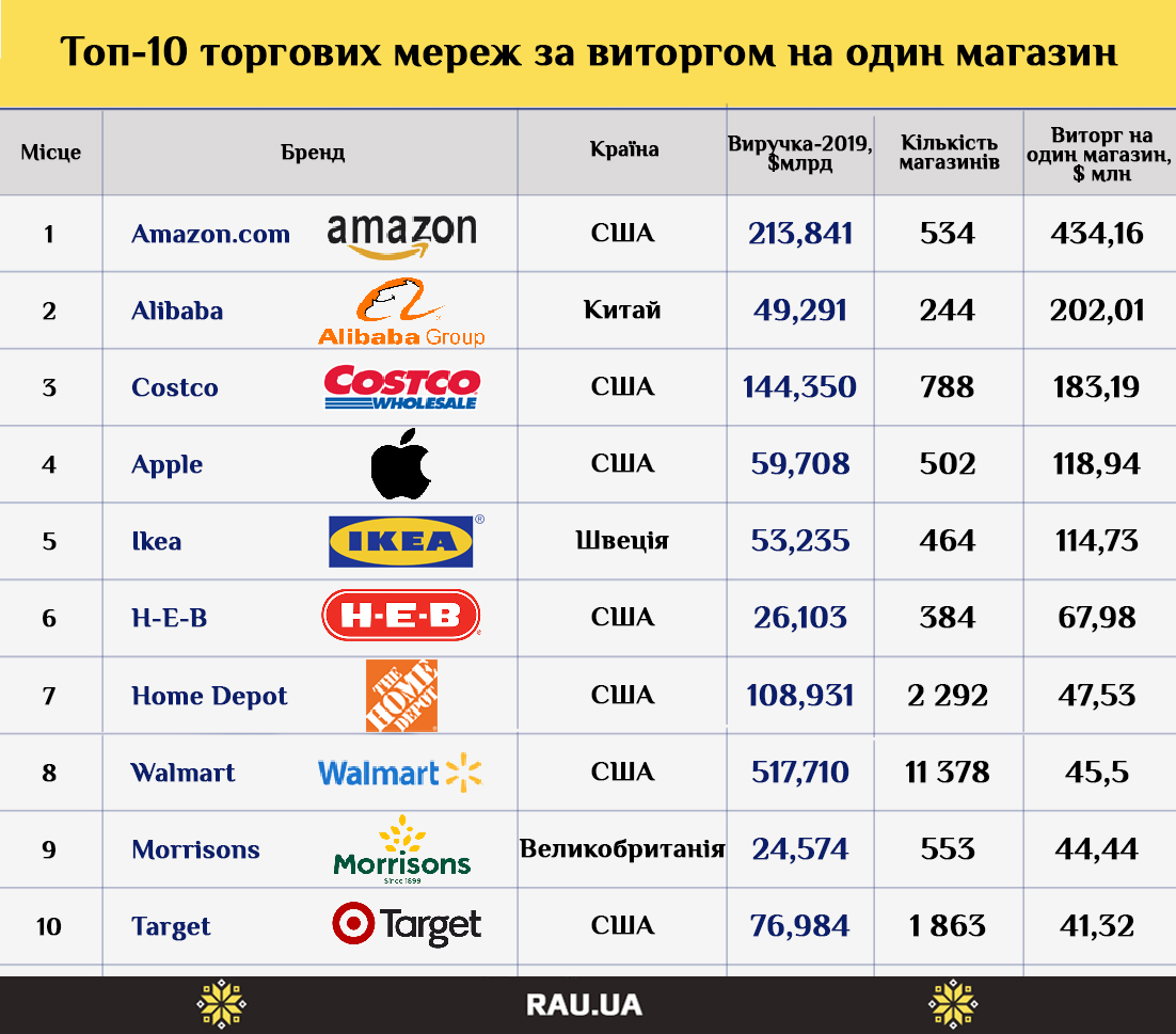 Заметно отличаются компании, начинавшие свой бизнес исключительно как онлайн-площадки, и лишь в последние годы начавшие активно строить сети «кирпичных» магазинов. Так, лучшим в 2019 году стал Amazon.com, чей выторг с одной точки составил $434,16 млн. У китайской Alibaba показатели вдвое хуже – «всего» $202 млн. Для сравнения: сеть Walmart с самым большим оборотом в мире по этому показателю всего на восьмом месте –$45,5 млн в год с каждого магазина.