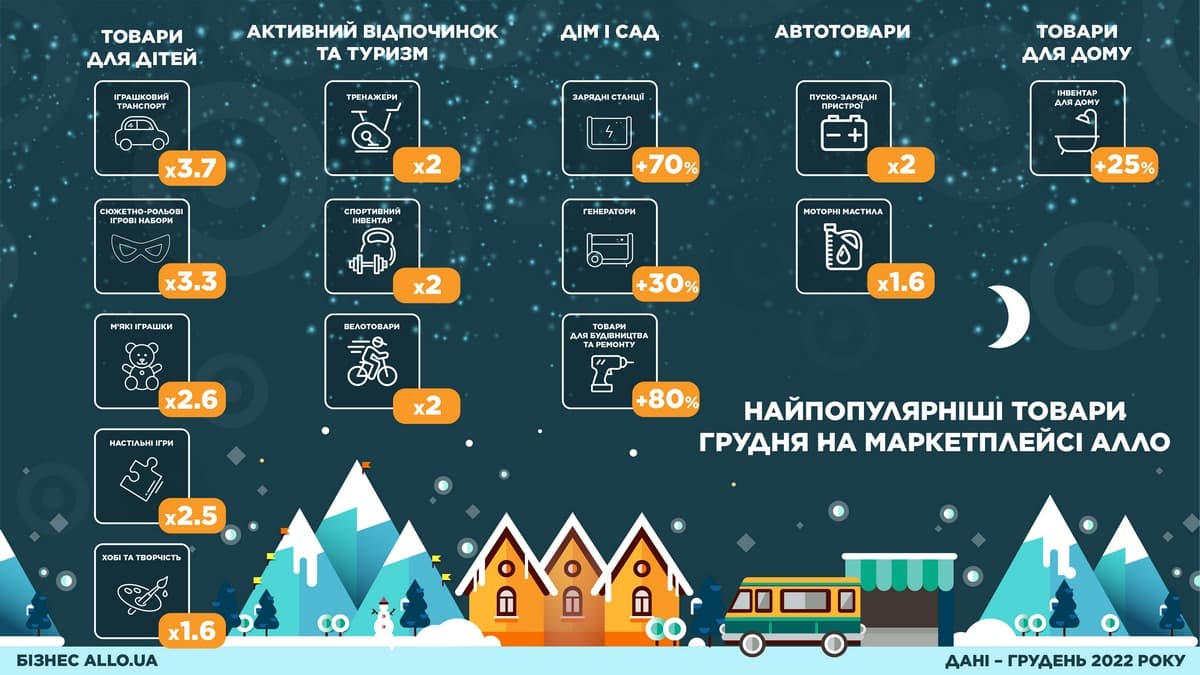«Военное время и блэкаут сказываются на структуре продаж маркетплейса Алло. Изменения отметили все наши партнеры, ведь хорошо видно, как за это время изменилась структура продаж. Зарядные станции, повербанки, генераторы и фонари все еще необходимы украинцам, поэтому их продолжают покупать. Однако, украинцы, вопреки всему, празднуют Рождество и Новый год и покупают подарки: в декабре снова появился спрос на товары для детей, а это была самая популярная категория и в декабре 2021 года», – отмечает Наталья Панкратова, операционный директор ГК «Алло» и руководитель маркетплейса allo.ua.