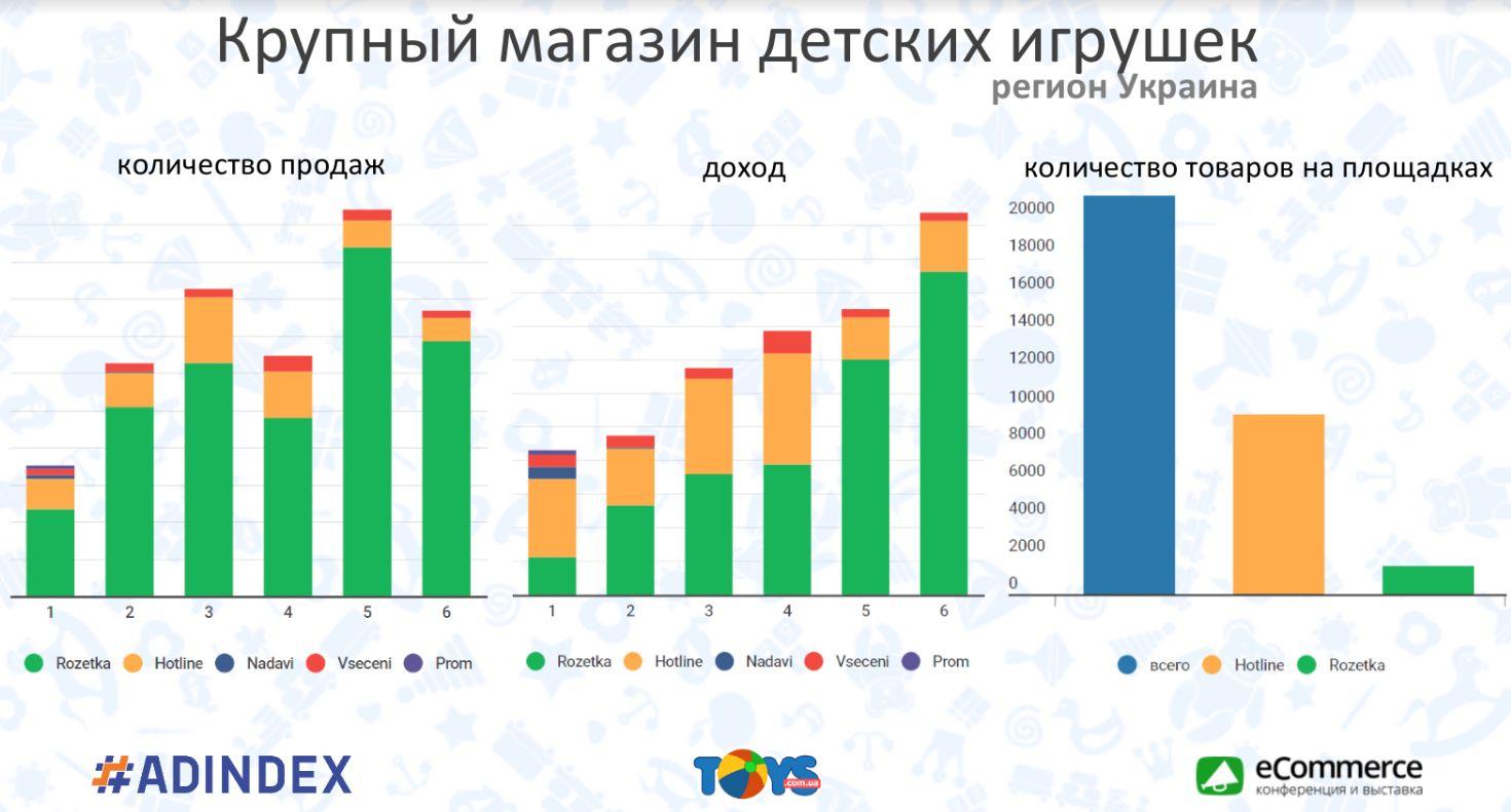 Данные AdIndex.ua по магазину детских товаров Toys.com.ua и доход от разных каналов сбыта: