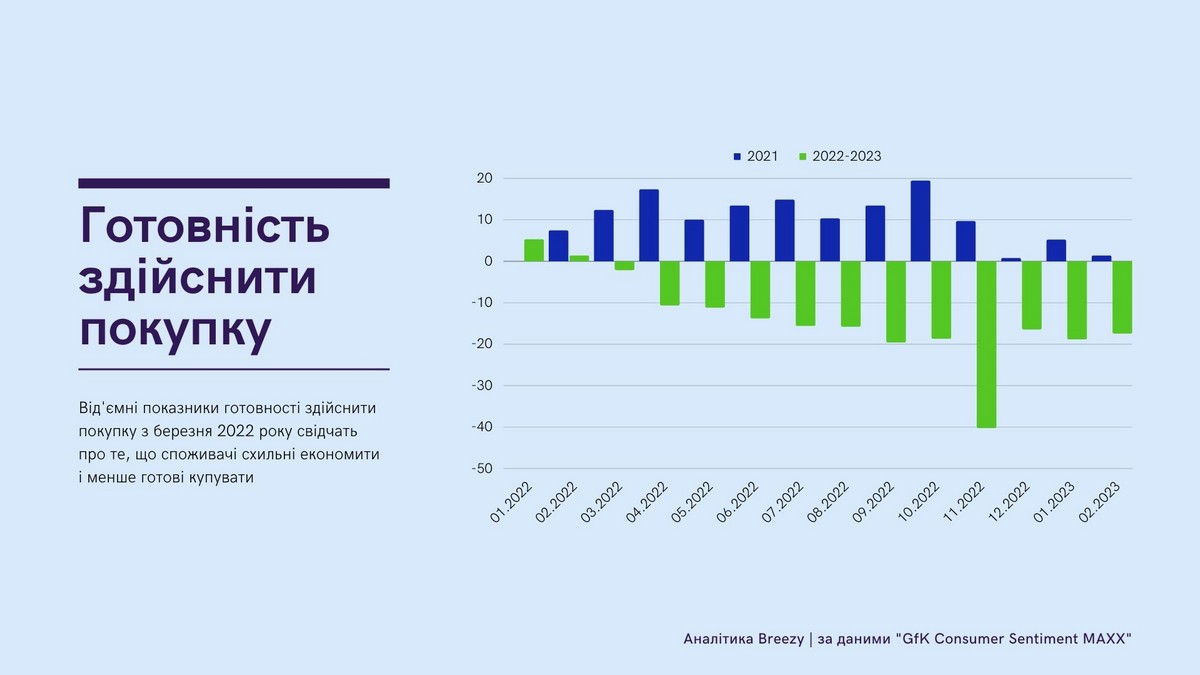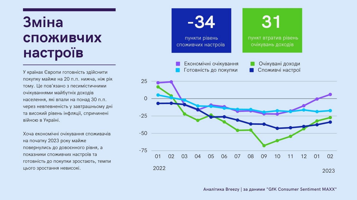 Это напрямую связано с пессимистическими ожиданиями будущих доходов у населения, которые упали более чем на 30 пунктов из-за неуверенности в завтрашнем дне и высокого уровня инфляции, вызванных войной в Украине. Хотя экономические ожидания потребителей в начале 2023 года почти вернулись к довоенному уровню, а показатели потребительских настроений и готовность к покупке растут, темпы этого роста невысокие.