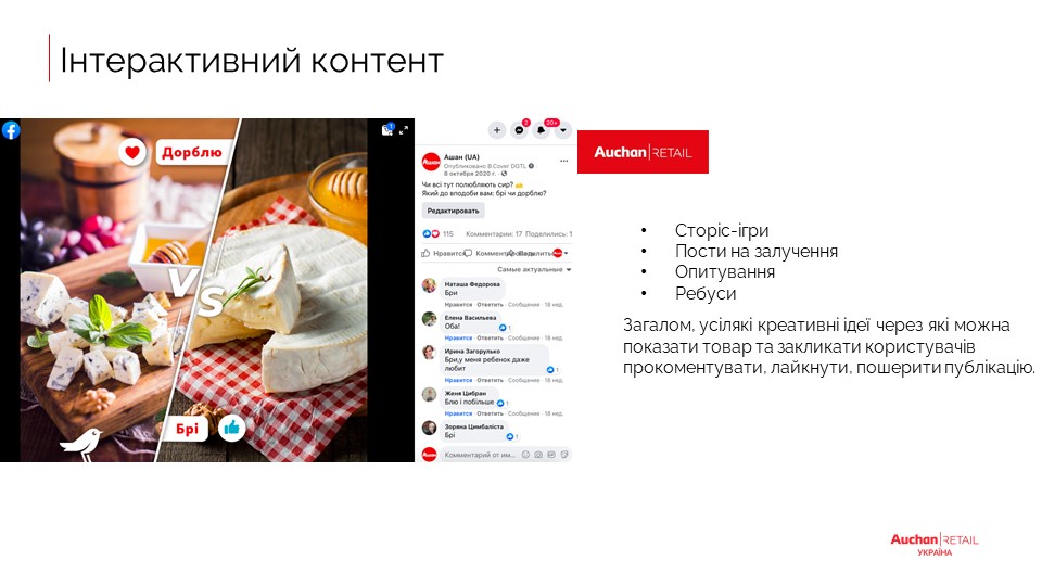 Интерактивный контент – еще одна примета новой реальности. Он может быть самым разным в зависимости от поставленных целей. Например, таргетированная реклама. Когда запускали Ашан Pick Up Point в новом жилом комплексе, сначала провели опрос среди его жителей на предмет желаемого ассортимента товаров. Эта быстрая обратная связь помогла соответствовать ожиданиям клиентов.
