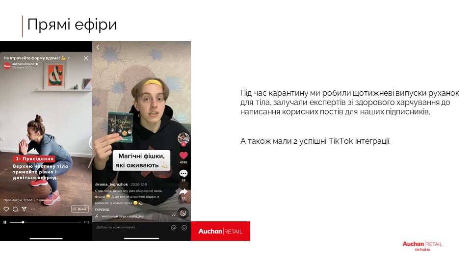 В период локдауна также стали очень популярны прямые эфиры. Возможность общения напрямую со спикером заменила реальное общение, которого многие были лишены. В Ашан нашли альтернативу прямым эфирам, открыв еженедельную рубрику выполнения физических упражнений на дому. Это хорошо сочеталось со стратегией пропаганды здорового образа жизни, в том числе здорового питания. Специально для этого проекта привлекались эксперты по здоровому питанию, которые делились своими советами.
