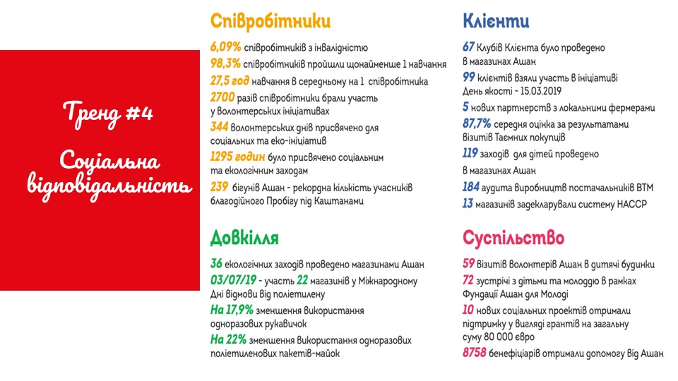 Четвертый тренд – социальная ответственность. В 2020 году произошло переосмысление ценностей. Клиенты склонны покупать у брендов социально ответственных. Ниже основные цифры по деятельности Ашан.