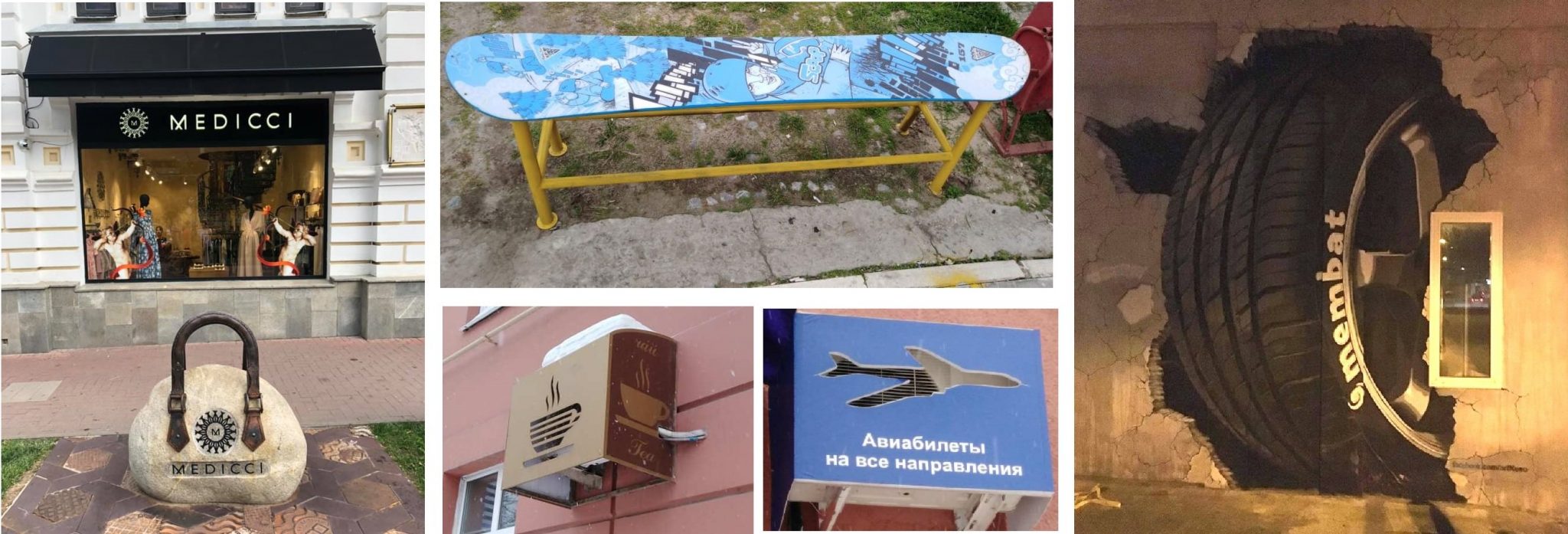 Камень превращен в сумку. Подчеркнули суть, бренд, создали фото-локацию. Скамейка из сноуборда у магазина экстремальных видов спорта. Кондиционер — выполняет работу вывески и наглядно отражает суть бизнеса. Граффити также может быть очень наглядным, например, как реклама точки по продаже шин.