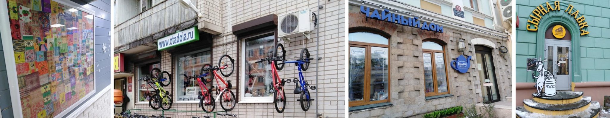 Всегда смотрите на соседей, расположенных с вами в одном ряду. Здесь важен явный контраст. Если стена однотонная — станьте ярким пятном. Вывеска, цветовое решение, обращение к покупателю. И наоборот, выделиться среди бесконечной рекламы можно белоснежной витриной. Минимум “шума”, максимум два цвета. Крупный шрифт, короткие фразы, минимум текста.
