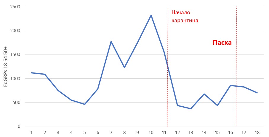 Активизация на 16-й неделе по сравнению с 15-й обусловлена началом флайта «Садовый бум» Эпицентра. И хотя продукты не связаны с Пасхой (садовая мебель, качели, грили), кампания закончилась сразу же после пасхальных выходных 21 апреля.
