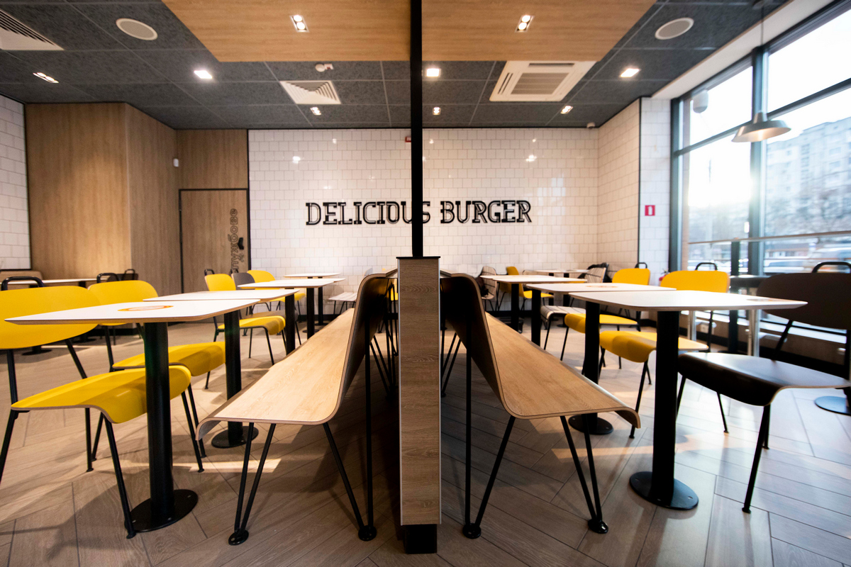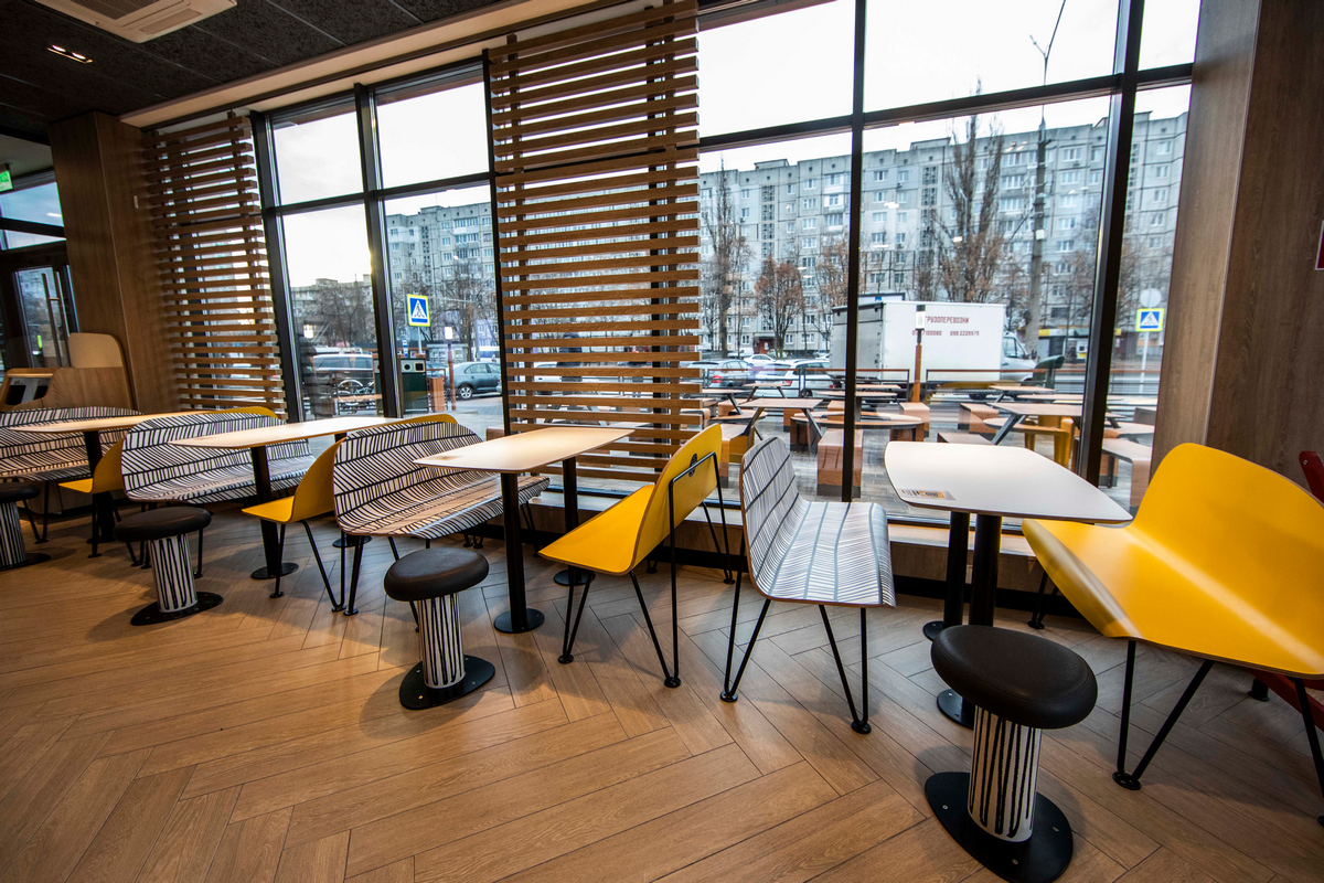 Новое одноэтажное заведение площадью 393 кв. м вместило 97 гостевых мест в зале и 146 на летней террасе, а интерьер оформлен в узнаваемом фирменном дизайне. Ресторан оборудован сервисами McDrive и McDelivery, а также оборудована комната для курьеров.