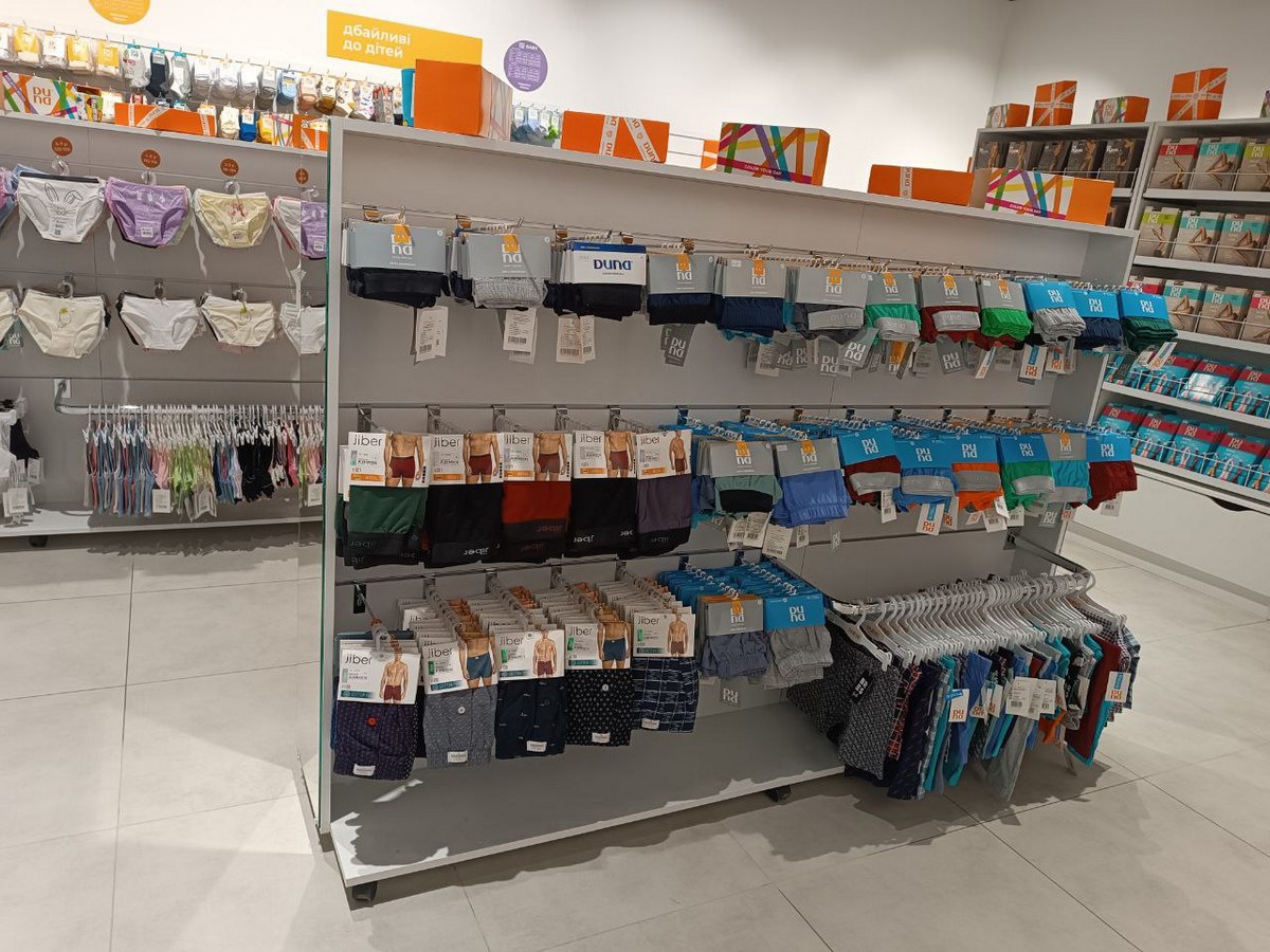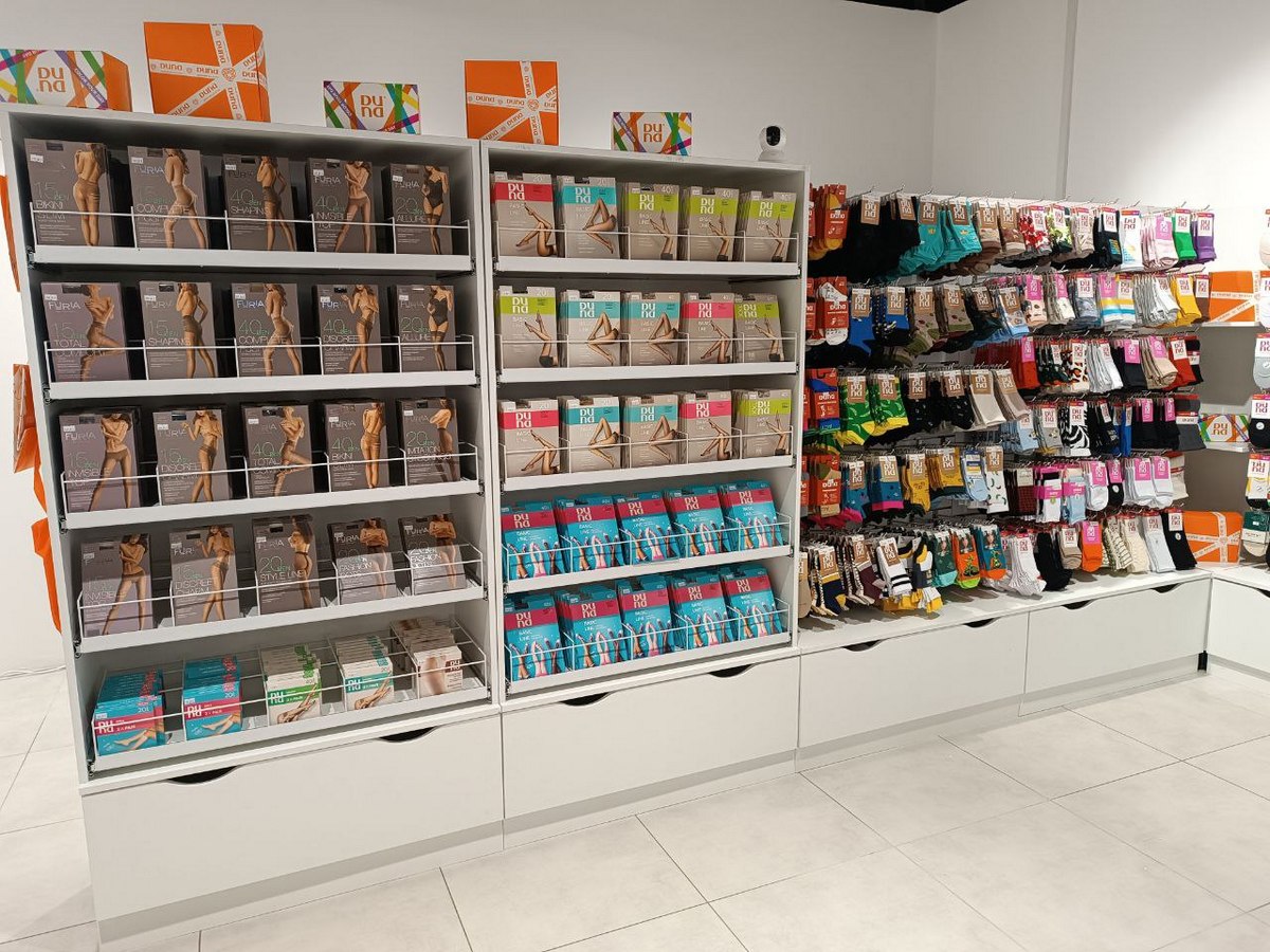 В магазине представлено более 5000 SKU, включая женское, мужское и детское белье, носки, одежду для сна и отдыха. В Duna представлены как базовые модели, так и трендовые новинки. Площадь магазина составляет 70 кв. м.