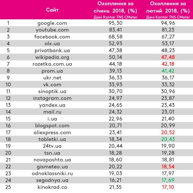 По данным Kantar TNS CMeter в феврале текущего года изменения в ТОП 25 популярных сайтов в Украине были незначительными. Первые три места, несмотря на небольшое снижение охватов в прошедшем месяце, по-прежнему занимают Google.com, Youtube.com и Facebook.com.