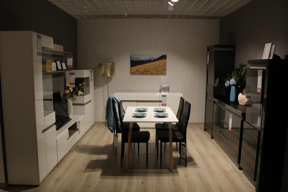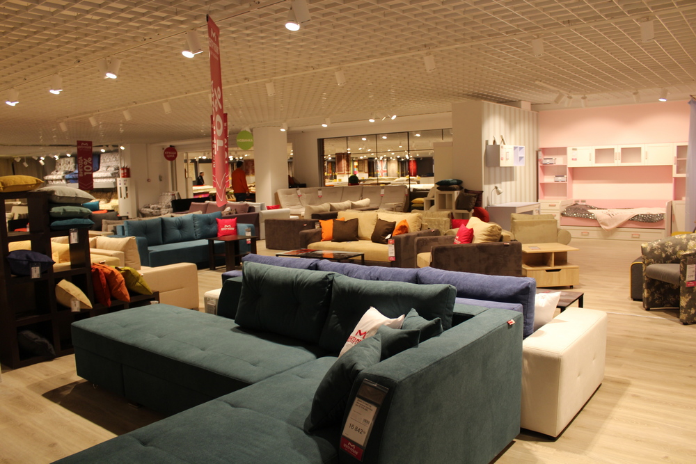 А на «минус первом» этаже находится крупнейший центр мебели – 4500 кв. м диванов, кресел, кухонь, спален, гостинных, ковров и так далее. От изобилия и ассортимента буквально разбегаются глаза.