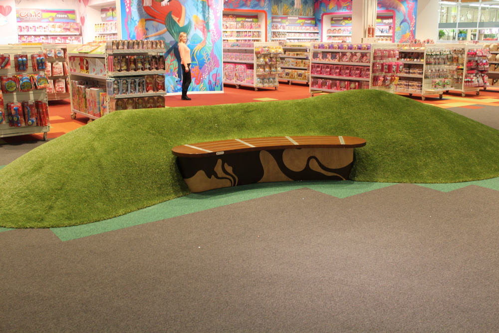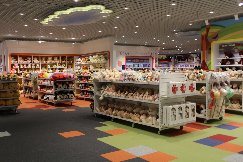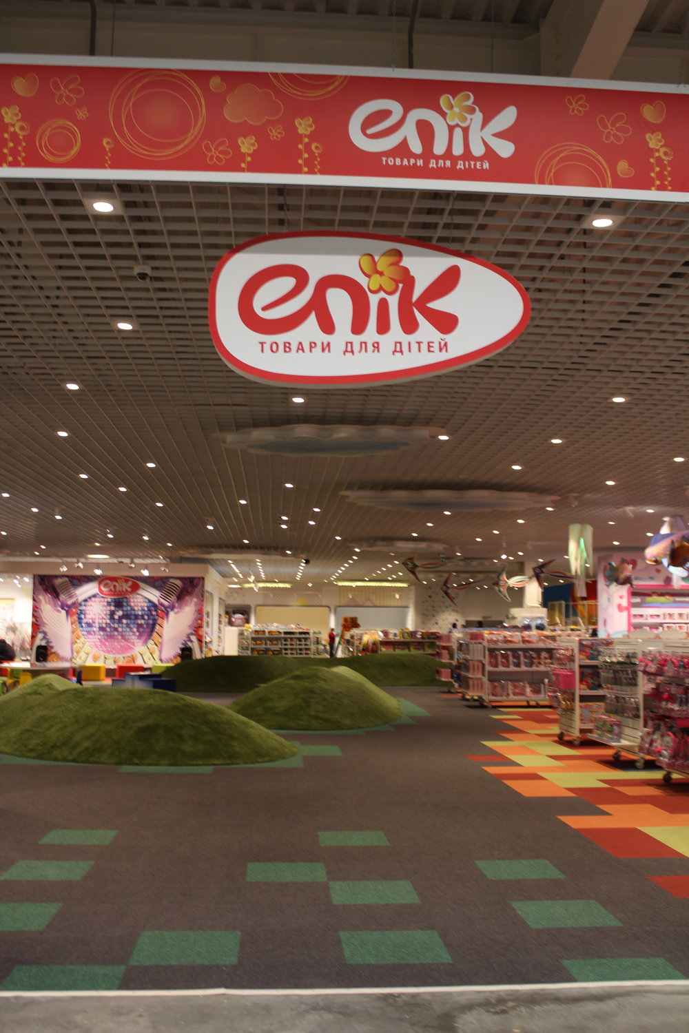 Магазин товаров для детей Епік аналогичной площади отличается не только жизнерадостной расцветкой, но и особым интерьером. Тут есть игровая комната, детская парикмахерская, а некоторые залы представляют собой искусственные лужайки с холмами. О чем, впрочем, достаточно легко забыть: сделано все вполне естественно.