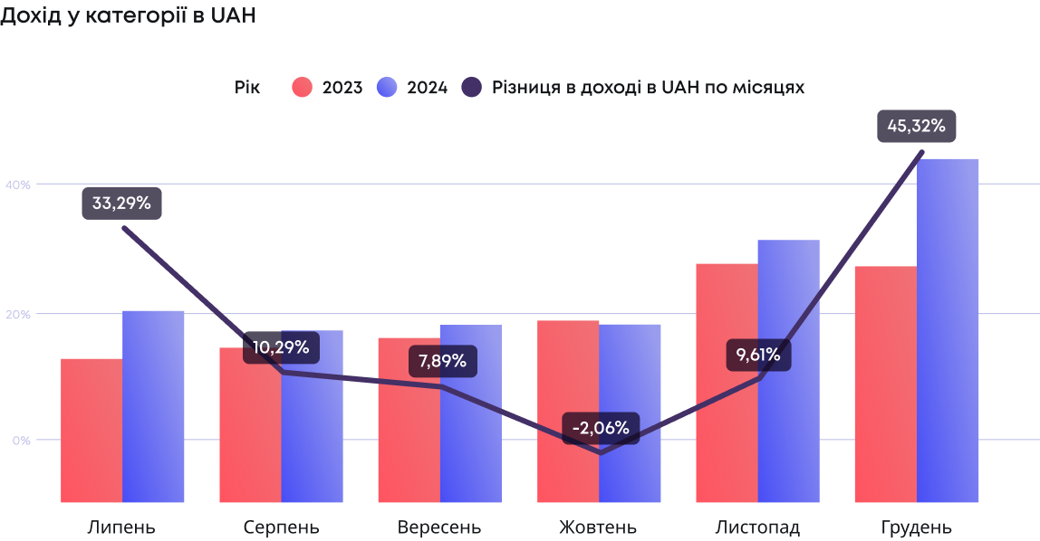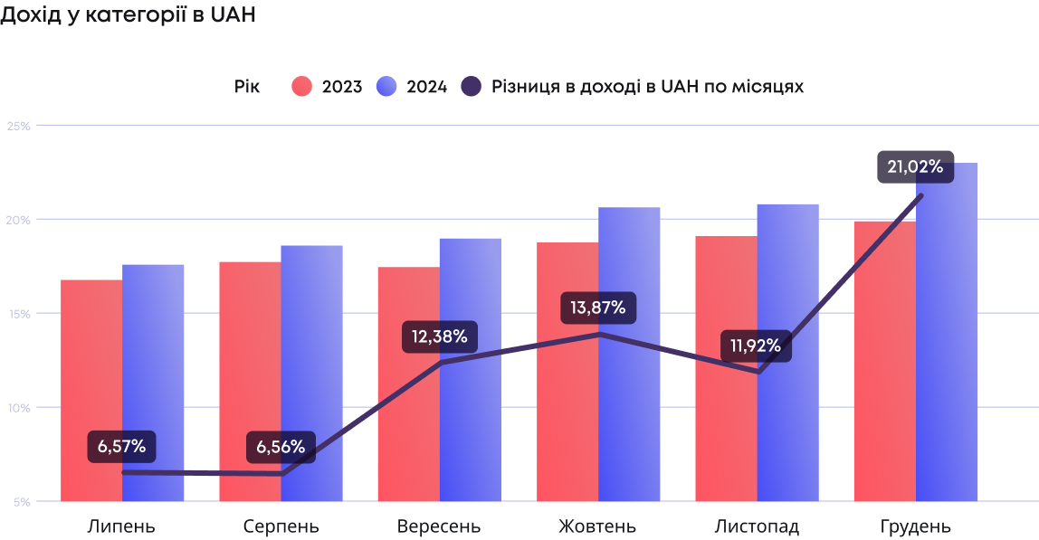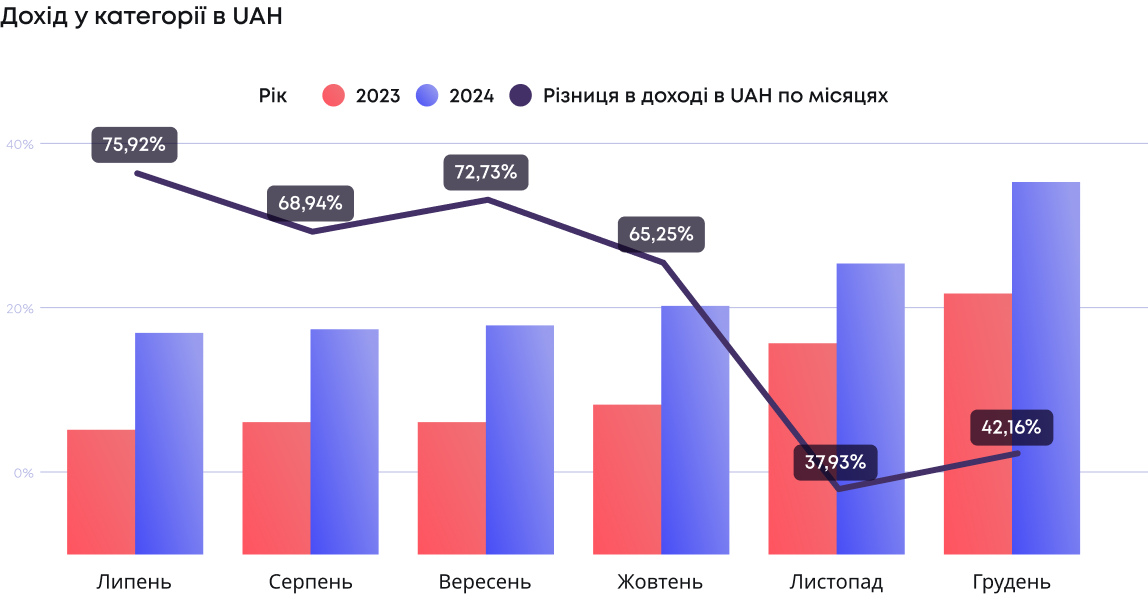 - В целом, за вторую половину 2024 года доход в категории увеличился на 18% в гривнях и на 8% в долларах. Из-за отсутствия активных распродаж к Back to shcool, в начале осени доход в категории просел. Однако период Черной пятницы и рождественских праздников стал для ритейлеров успешнее прошлогоднего: доход увеличился до 40% в гривнях.