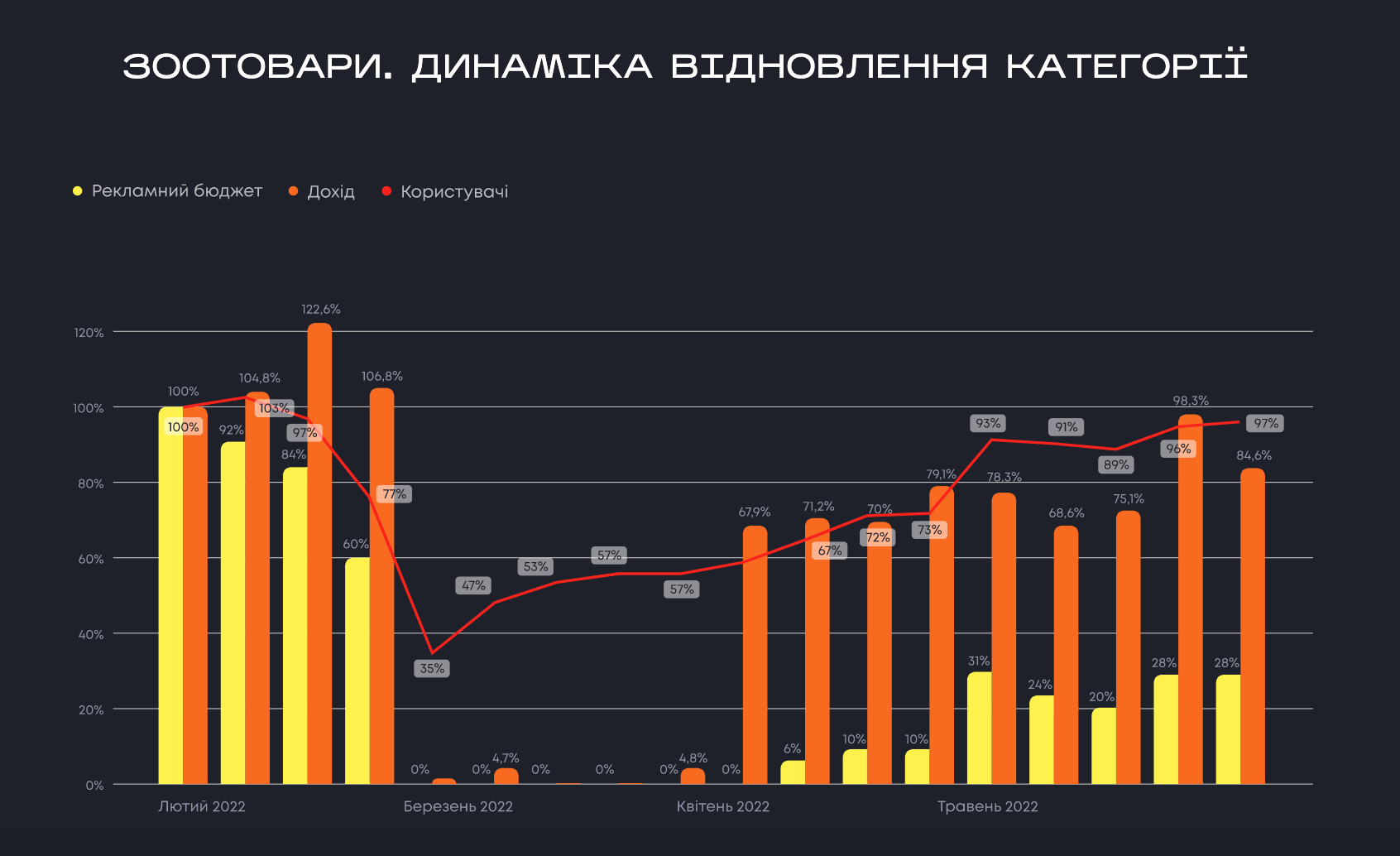 - Зоотовары – одна из наиболее быстро восстановившихся в онлайне категорий: на конец мая количество пользователей и доход практически вернулось к показателям первой недели февраля. Доход на уровне 85%, а пользователи – 95%, в то же время рекламные бюджеты в среднем составляют всего 26% от довоенных.