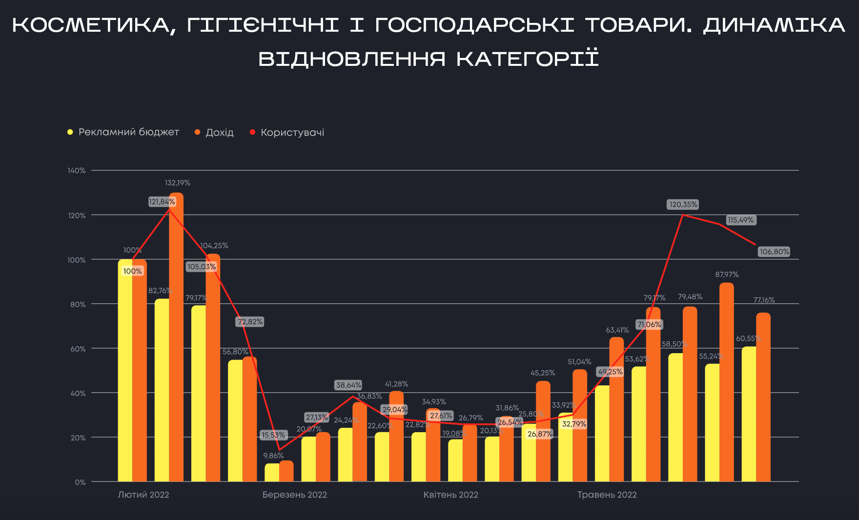 - В конце мая-начале июня количество пользователей стало больше показателей первой недели февраля, в то же время доходность составила 80% от довоенного периода, а рекламные бюджеты в среднем составляли 50% от февральских. Украинцы привыкли к новым условиям и вернулись к вопросу ухода за собой.