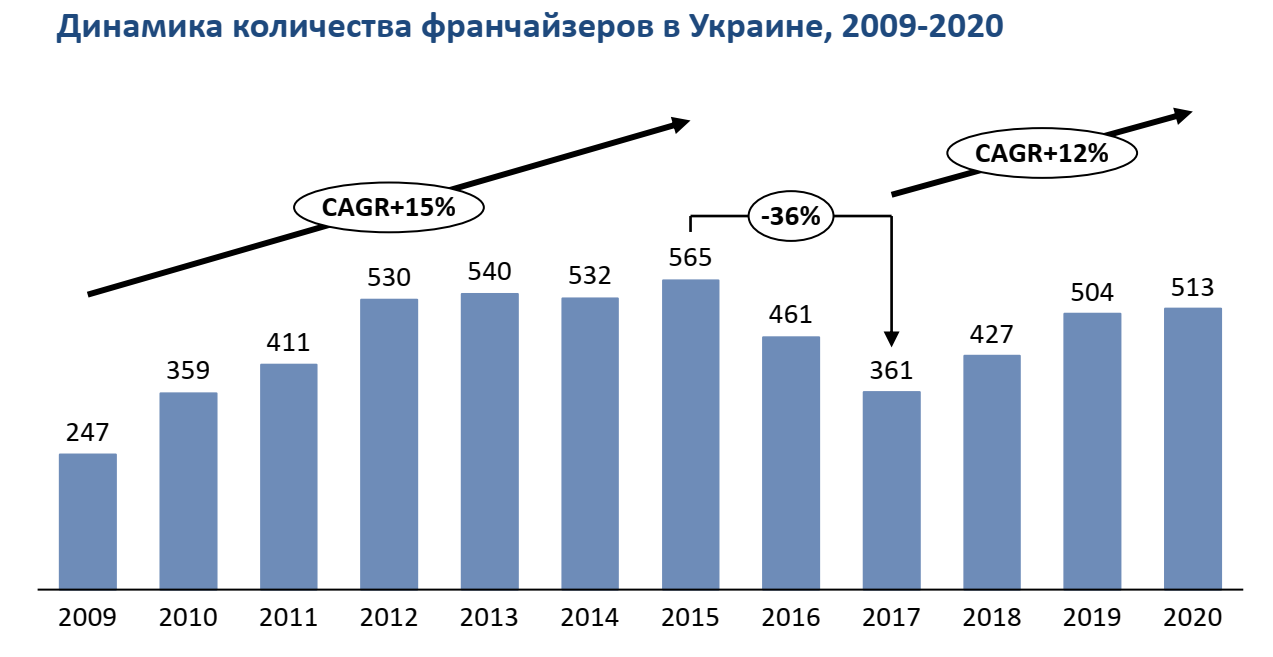 Судя по возобновлению среднегодовых темпов роста, можно говорить если не о завершении кризиса, то большом потенциале данного сегмента. Украина имеет все шансы стать самой продвинутой в Европе страной по части развития франчайзинга.