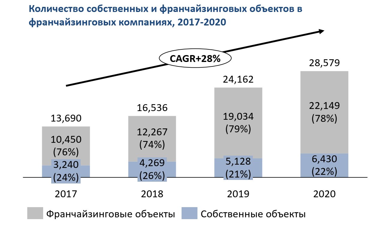 Например, наш клиент Fedets family bakery (Франс.уа, Сімейна Пекарня) имеет примерно 20 собственных объектов, в то же время вся сеть их торговых точек составляет уже около 500 объектов. Аналогично в качестве примера можно привести заведения Семья ресторанов Борисова, G.Bar, ЭКО лавка, Львівська майстерня шоколаду. Это тенденция всех компаний, которые выбрали модель развития через франчайзинг. И как показывает практика – очень удачно.