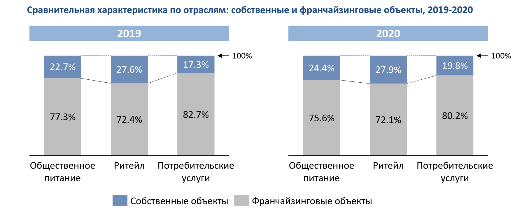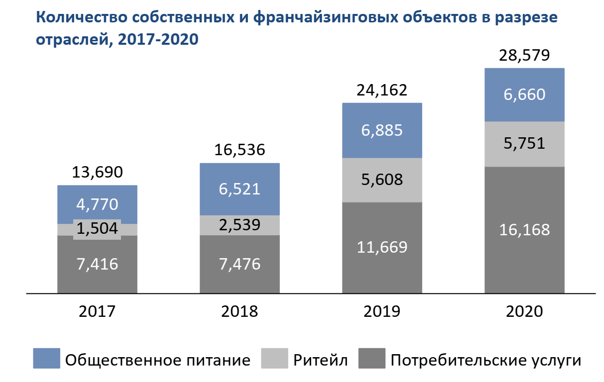 Поэтому уже не первый год на первом месте оказывается оказание услуг: детского обучения, салонов красоты и других услуг для населения. В розничной торговле хорошо развивается по франшизе только продуктовый ритейл. Так как он меньше всего ограничен необходимостью иметь свою производственную базу.