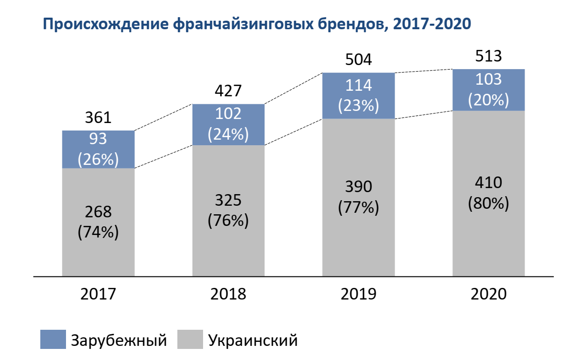 Также вполне закономерным выглядит постоянный рост доли именно украинских франшиз, так как сама модель бизнеса лучше учитывает местные реалии. Бизнес, родившийся в Украине, более адаптируем под местные требования рынка.
