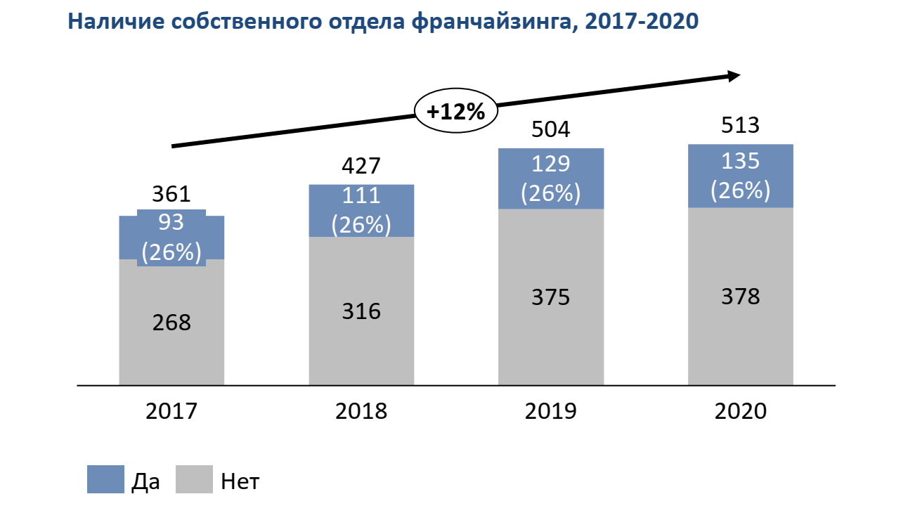 Нельзя не заметить, что при росте общего числа франчайзеров, сохраняется постоянный процент (26%) компаний, у которых есть свой отдел франчайзинга. Этот факт объясняется просто. Среди 513 компаний франчайзеров, самых известных и быстрорастущих не более 25-30%. То есть, такой отдел есть у тех компаний, для которых их франшиза стала продуктом. Их задача – усовершенствовать концепт, маркетинг, организационную структуру, придумывать новшества. А задача франчайзи – реализовывать эту ценность для конечного клиента, давая обратную связь франчайзеру.