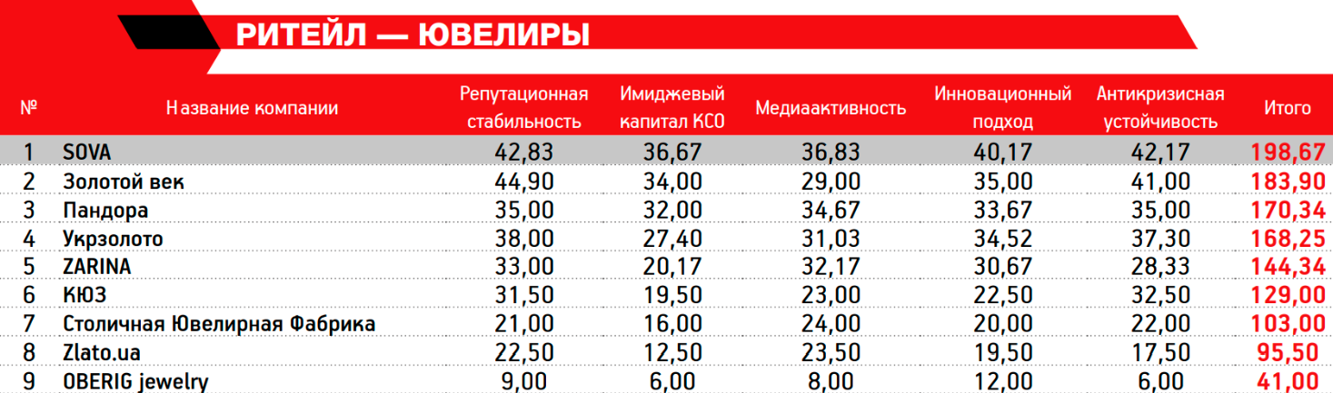 Среди продавцов ювелирных товаров первое место с заметным отрывом от остальных занял ювелирный бренд Sova. На втором месте сеть Золотой век, опередившая лидера из категории “репутационная стабильность”. Также в первую пятерку попали Pandora, Укрзолото и Zarina, которые опережают друг друга по тем или иным отдельным репутационным параметрам.