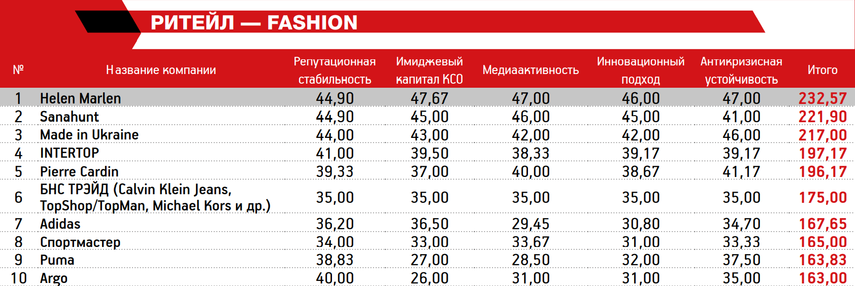 В категории “имиджевый капитал КСО” попало сразу четверо ритейлеров из разных сегментов. Второе место заняла Helen Marlen (47,67 баллов), в районе шестого-восьмого места – Liki24 и Sanahunt (по 45 баллов) и на десятом – АТБ (44,27 баллов). Половина наиболее медиаактивных компаний оказались также ритейлеры – Helen Marlen, Liki24, Sanahunt, 23 ресторана и Семья ресторанов Димы Борисова. Самое высокий, среди других, инновационный подход эксперты отметили в Helen Marlen (3-4 место, разделенное с Carlsberg Ukraine), а также Холдинг эмоций !Fest, Liki24, Sanahunt и АТБ. Также, по параметру “антикризисная устойчивость”, эксперты отметили наивысшими баллами, опять-таки, Helen Marlen, а также Made in Ukraine.