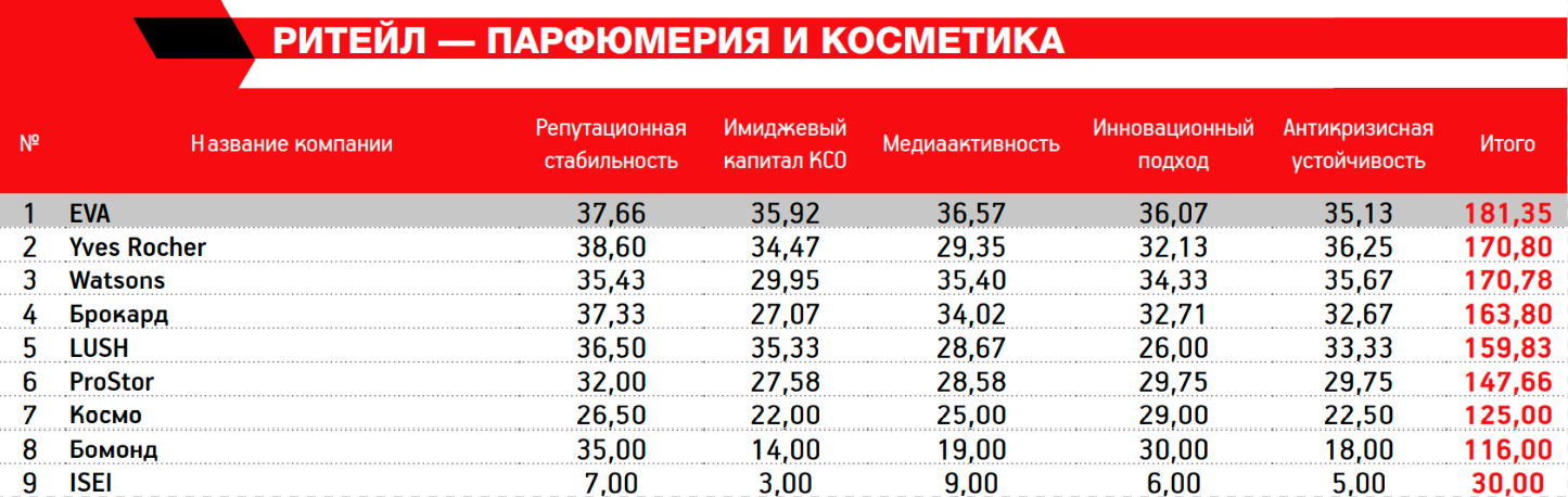 В сегменте парфюмерно-косметических магазинов первое место заняла крупнейшая drogerie-сеть в Украине – EVA. За ней, с разницей в 0,2 балла между собой, следуют Yves Rocher и Watsons. Французский косметический бренд смог преодолеть ближайшего конкурента в рейтинге по имиджевому капиталу КСО, хотя и значительно уступил в медиаактивности. Четвертое и пятое место заняли бренды Brocard и Lush.