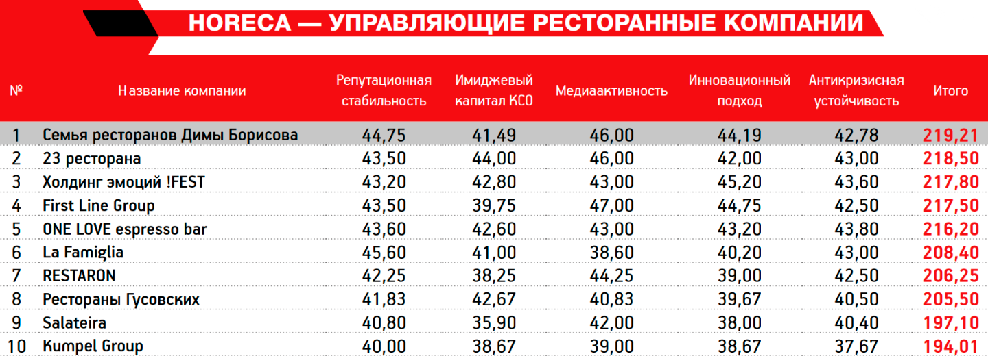 В ресторанном бизнесе победителем стала семья ресторанов Димы Борисова (Gastro Family). За ней на втором месте, с разницей всего в 0,71 балла, разместилась компания “23 ресторана” (заведения Fabbrica, Urban Space 100, Delikacia и другие). На третьем месте Холдинг эмоций !Fest, который недавно вышел со своим форматом Пьяная вишня на рынок Румынии. На четвертом месте, с разницей с львовянами в 0,3 балла, компания First Line Group (заведения ЖЗЛ, Любимый дядя, Наша Дача и другие). Замыкает первую пятерку сеть эспрессо баров One Love.
