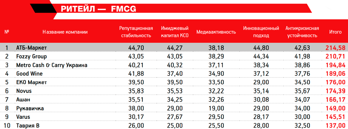 В сегменте продуктового ритейла первое и второе места разделили между собой АТБ и Fozzy Group, которых разделяет чуть менее четырех баллов. АТБ опередил ближайшего конкурента, прежде всего, за счет репутационной стабильности и имиджевого капитала КСО (корпоративной социальной ответственности). За ними следуют Metro Cash &Carry Ukraine, Good Wine и ЭКО маркет, которых между собой в среднем разделяет 5 баллов. Замыкаю десятку лидеров Таврия В.