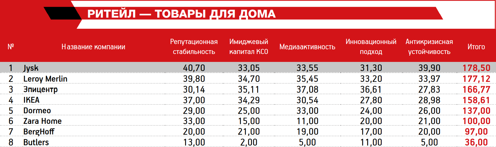 В сегменте товаров для дома первые два места заняли датский бренд JYSK и французский Leroy Merlin. Их разделяет всего 1,38 баллов. На третьем месте сеть Эпицентр. В свою очередь, IKEA пока не набрала достаточного репутационного капитала в Украине. Несмотря на медийную шумиху и общественное внимание к бренду, шведская компания заняла лишь четвертое место по результатам голосования экспертов.