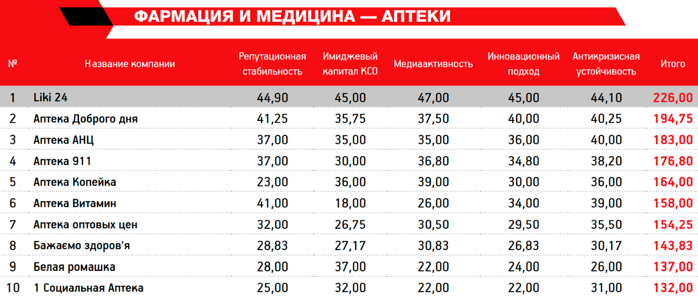В аптечном сегменте первое место занимает аптечный маркетплейс Liki24. Вторая и третья ступенька репутационного топа – за Аптекой Доброго дня и Аптекой АНЦ. Также в первой пятерке – Аптека 911 и Аптека Копейка.