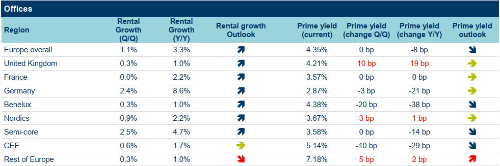 Ставки доходности на наиболее качественные офисные помещения остались на уровне 4,35%, самом низком с момента начала исследований в июне 2002 года. Арендные ставки в сегменте выросли на 1,1% по сравнению с предыдущим кварталом, а в годовом исчислении – на 3,3%, что является самым быстрым темпом роста с 2012 года. Германия остается лидером: арендные ставки выросли на 2,4% в квартальном исчислении на фоне высокого спроса и недостаточного объема предложения в классе А.