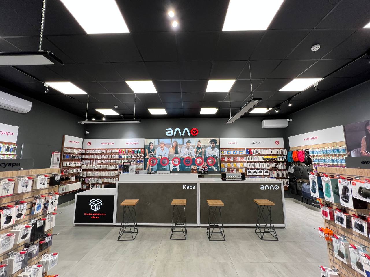 Оба новых магазина Алло – просторные: их торговая площадь составляет более 120 кв. м. Тут представлен основной ассортимент товаров сети: планшеты, ноутбуки, телевизоры, смартфоны, электротранспорт, смарт-часы, фитнес-браслеты, бытовая техника, зарядные станции, повербанки, колонки, наушники, бьюти-гаджеты, товары для гейминга, автотовары, аксессуары и другая смарт-техника. Клиенты могут приобрести продукцию мировых производителей: Apple, Samsung, Motorola, Nokia, JBL, Amazfit, Baseus и других.