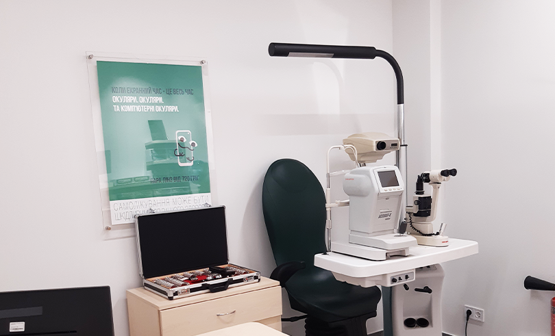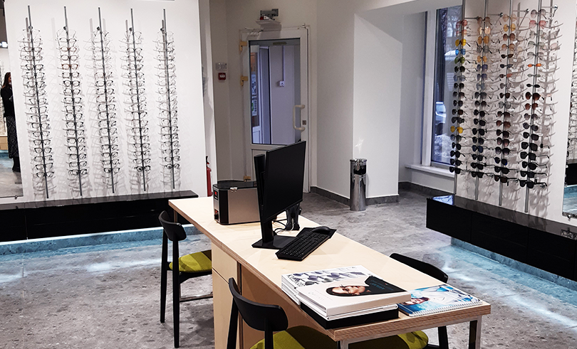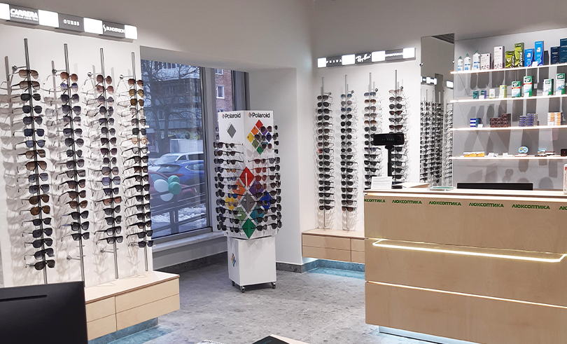 При планировании торгового пространства в Умани особое внимание было уделено не только современному дизайну, но и эргономичности. Территория магазина составляет 90 кв. м и для максимального удобства клиентов разделена на четыре зоны: кабинет врача, кабинет мастера-оптика, отдельные зоны солнцезащитных очков и оправ.