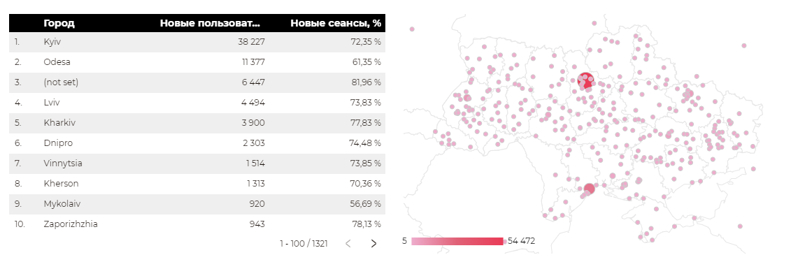 Ежемесячно мы отслеживаем географию новой аудитории нашего сайта, после чего таргетологы получают информацию о том, какой регион Украины требует более плотного покрытия.