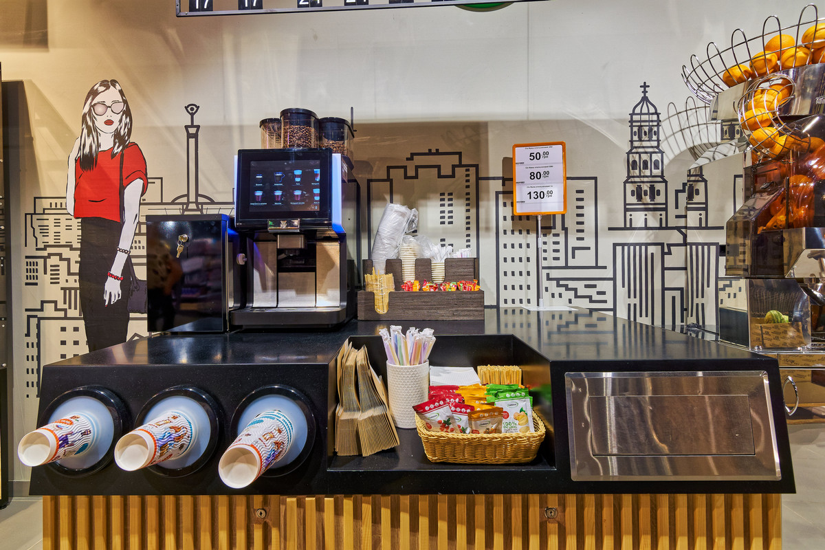 Также в наличии салат-бар, кофе-зона, стойка со своими сладкими напитками и десертами. Для быстрого перекуса есть хот-доги и сэндвичи.