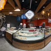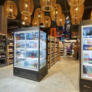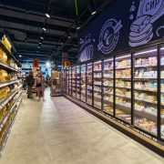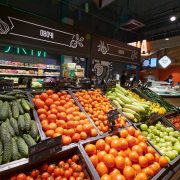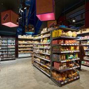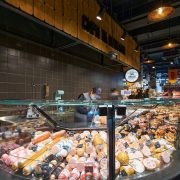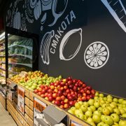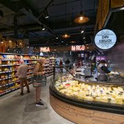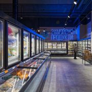 Интерьер магазина украсили деревянными подвесными конструкциями и осветили стильными лампами. На полках магазина: свежие овощи, фрукты, мясные деликатесы, колбасы и сыры из разных стран мира. Вся продукция не оставит равнодушным даже самого требовательного гурмана.
