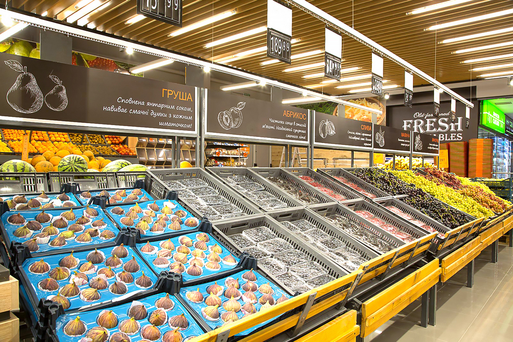 Торговый зал супермаркета оформлен большими видеостенами, на которых транслируются рецепты, красивые примеры сервировки блюд, информация об актуальных акциях.