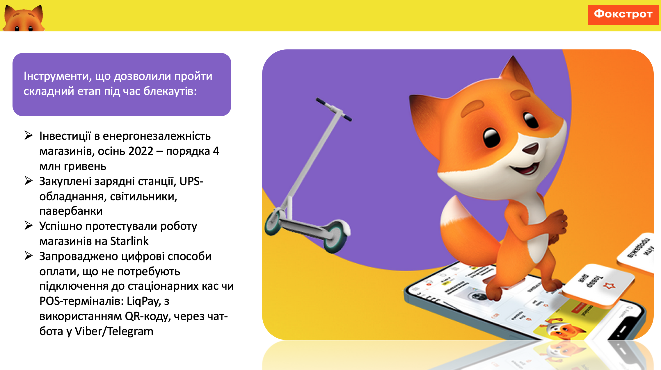 Сеть Фокстрот продолжает работать, несмотря на все сложности, которые сейчас нам приходится преодолевать. Первого сентября этого года нам исполнилось 29 лет. Мы одна из старейших сетей, которая продает бытовую технику и электронику в Украине, и мы продолжаем активно развиваться и внедрять новые технологии.