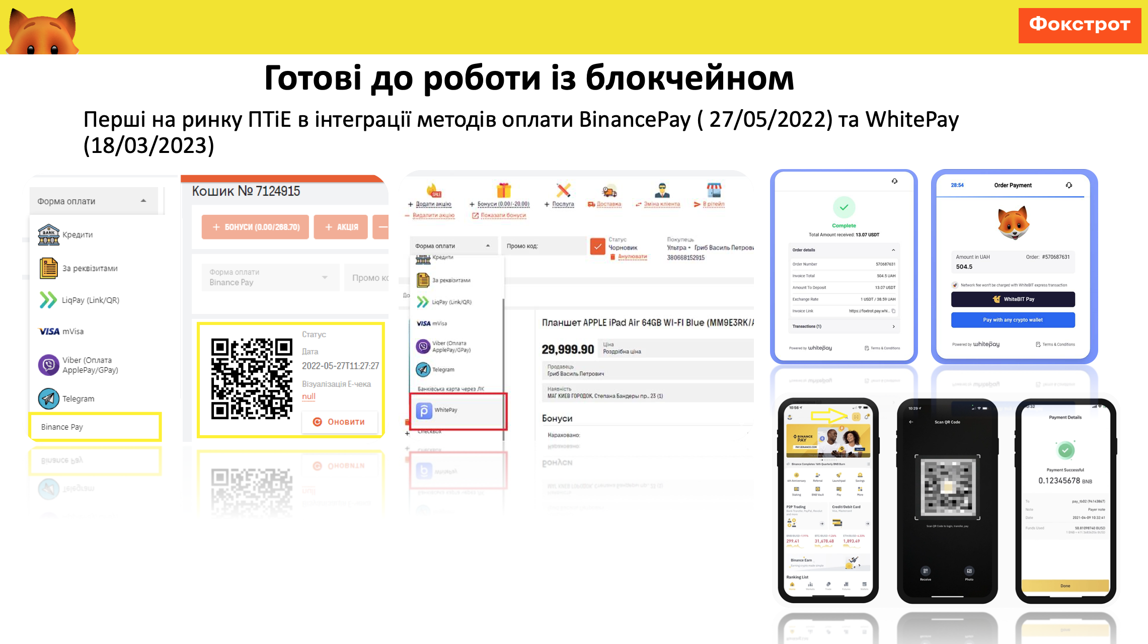 Если говорить о дальнейшем развитии технологий, то нужно обязательно упомянуть блокчейн. Сеть Фокстрот в партнерстве с Binance первой провела обучение своих работников обучение продавцов по блокчейну. Наша цель заключалась в том, чтобы наши продавцы-консультировали понимали, что это за технология, какие преимущества она предоставляет и какая безопасность стоит за этой технологией.