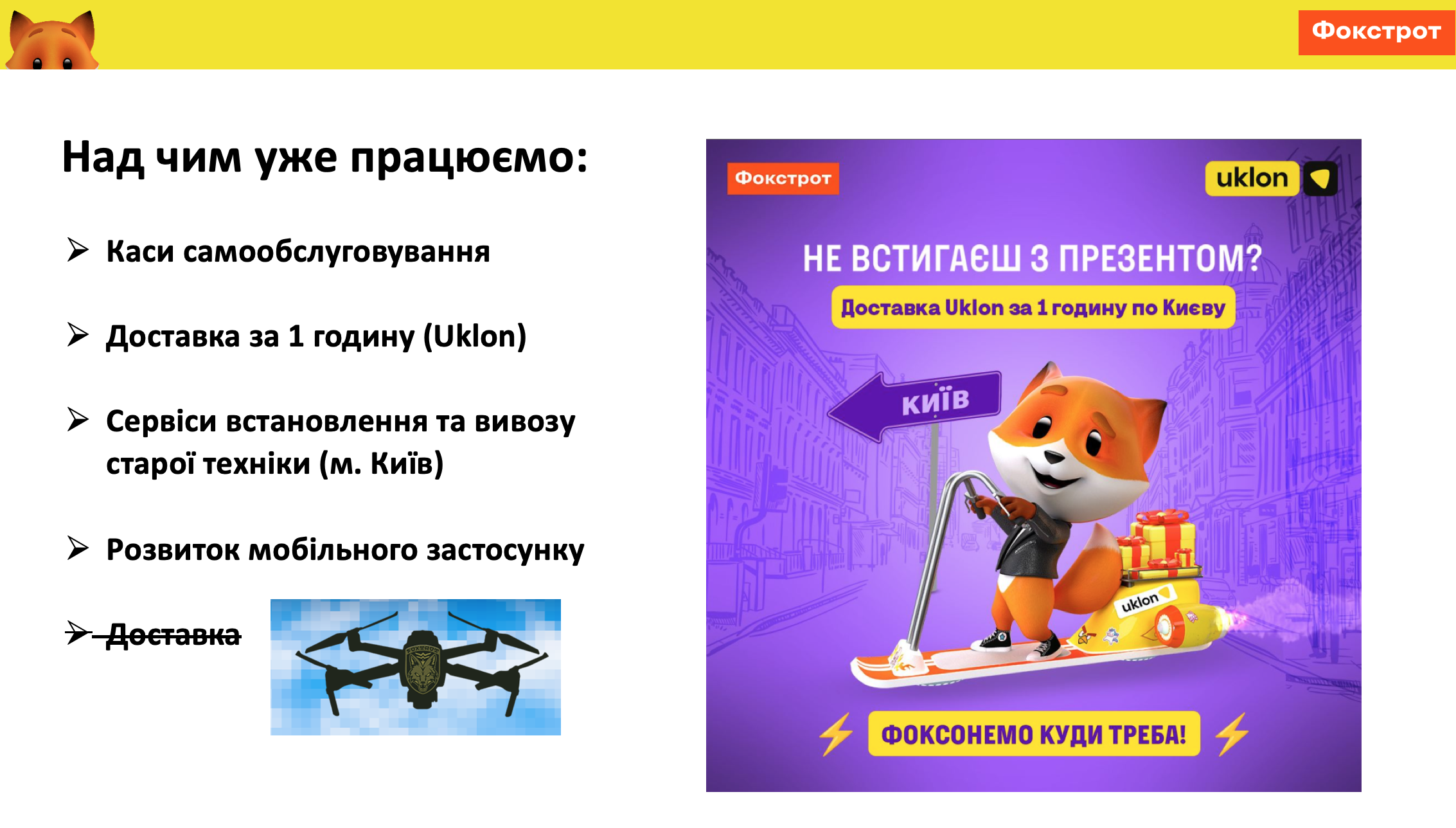 До войны мы планировали запустить доставку дронами и даже тестировали доставку дроном товара со склада или другого магазина в магазин, который удобен клиенту. Но полномасштабное вторжение России заставило нас пока отказаться от этой услуги. Как мы знаем, сейчас у всех украинских дронов совсем другая задача.