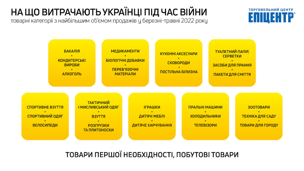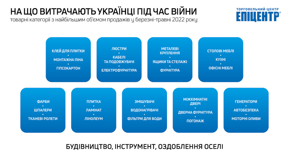 Помимо общего сокращения рынка из-за выезда части населения за границу, в сети Эпицентр также фиксируют географическое перераспределение потребления, связанное с переселением украинцев в относительно более спокойные западные регионы страны. Также наблюдается тенденция к экономии средств. Украинцы все чаще отказываются от приобретения дорогостоящих товаров и в основном закупают продукцию первой необходимости.