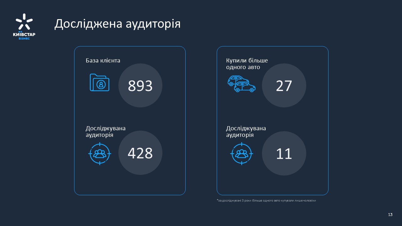 Для анализа обычно необходимо большое количество абонентов — 10 000. Однако у нас было всего 893 абонента, из которых удалось проанализировать только 428, поскольку они были абонентами Київстар. А 27 клиентов приобрели более одного автомобиля.