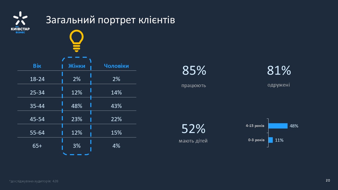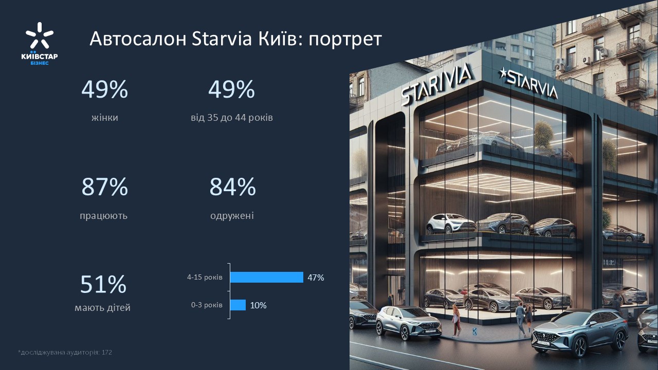 На примере автосалона в столице можем увидеть, что 49% – это женщины в возрасте 35-44 лет, 87% работают, а 51% имеют детей.