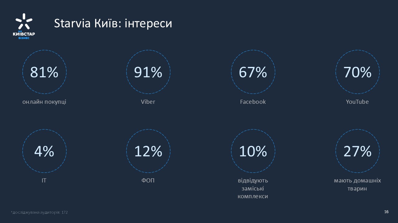 А также определили интересы: 81% онлайн-покупатели, активно использующие социальные сети, 4% работали в IT, а 12% – предприниматели, 10% посещают загородные комплексы и 27% имеют домашних животных.