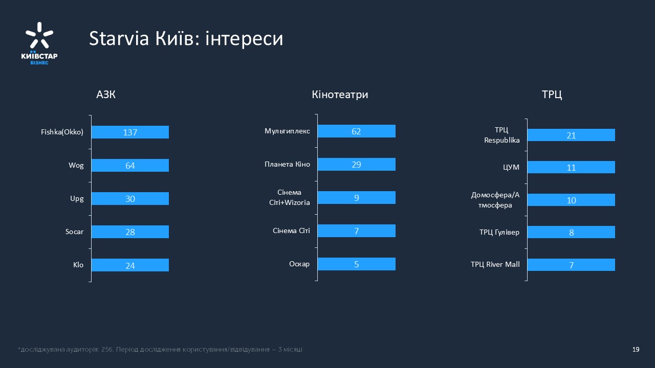 Открытием было то, что наибольшая часть этих клиентов пользуется АЗК ОККО. Это определенный инсайт, где можно дополнительно общаться с этой аудиторией. Также показали, какие они посещают ТРЦ и кинотеатры.