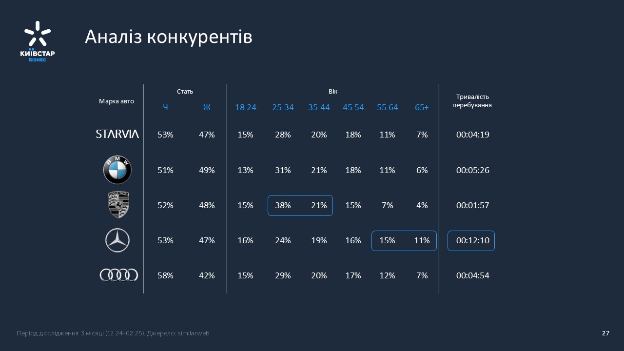 Далее сформировали конкурентный перечень и посмотрели, как автомобильные бренды себя ведут. Достаточно интересный тренд, что сайт Porsche посещает более молодая аудитория, но не факт, что покупают. На сайте Mercedes аудитория задерживается на 12 минут, при этом среднее время – до 4 минут.