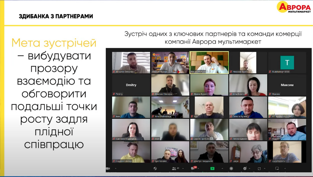 Также Аврора организует ежеквартальные встречи “Здыбанки” с поставщиками, проходящими в формате Zoom-конференций. Это позволяет не только поделиться достижениями, но и обсудить планы на будущее. В ходе таких встреч обсуждаются такие важные вопросы, как выполнение плана, открытие новых магазинов, достижение целей и будущие инновации.